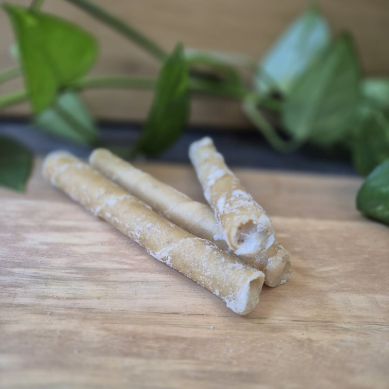 Dit kauwstaafje is gemaakt van buffelhuid gevuld met schapenvet. Erg lekker! Wist je dat schapenvet rijk is aan Omega 3 – 6 en 9 vetzuren? Dit helpt de vertering te verbeteren en ondersteunt een betere voedselopname. Lengte ca. 13 cm.
